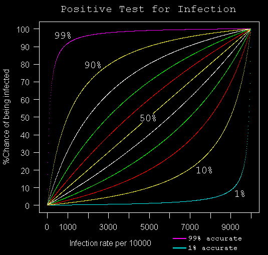 The x-axis represents infection rate per 10,000 of the population, the y-axis represents one’s chance of being infected, from 0%, for no chance, to 100%, for complete certainty. The coloured curves represent tests of different accuracy: 1% accurate, for the bottom curve, and 99% accurate, for the uppermost curve. The curves between the two represent tests of 10% to 90% accuracy. Note how the curves mirror each other: the 99% accurate test rises towards certainty very quickly, but takes a long time to finally get there. The 1% accurate test stays near complete uncertainty for a long time, then finally rises rapidly towards certainty. In other words, a positive result on a 99% accurate test is equivalent to a negative result on a 1% accurate test, and vice versa. Ditto for the 90% and 10% accurate tests, and so on. But a positive (or negative) result on a 50% accurate test is useless, because it never tells you anything new: your chance of being infected, given a positive result, is the same as the rate of infection in the population. And when exactly half the population is infected, your chance of being infected, given a positive result, is the same as the accuracy of the test, whether it’s 1%, 50%, or 99%.