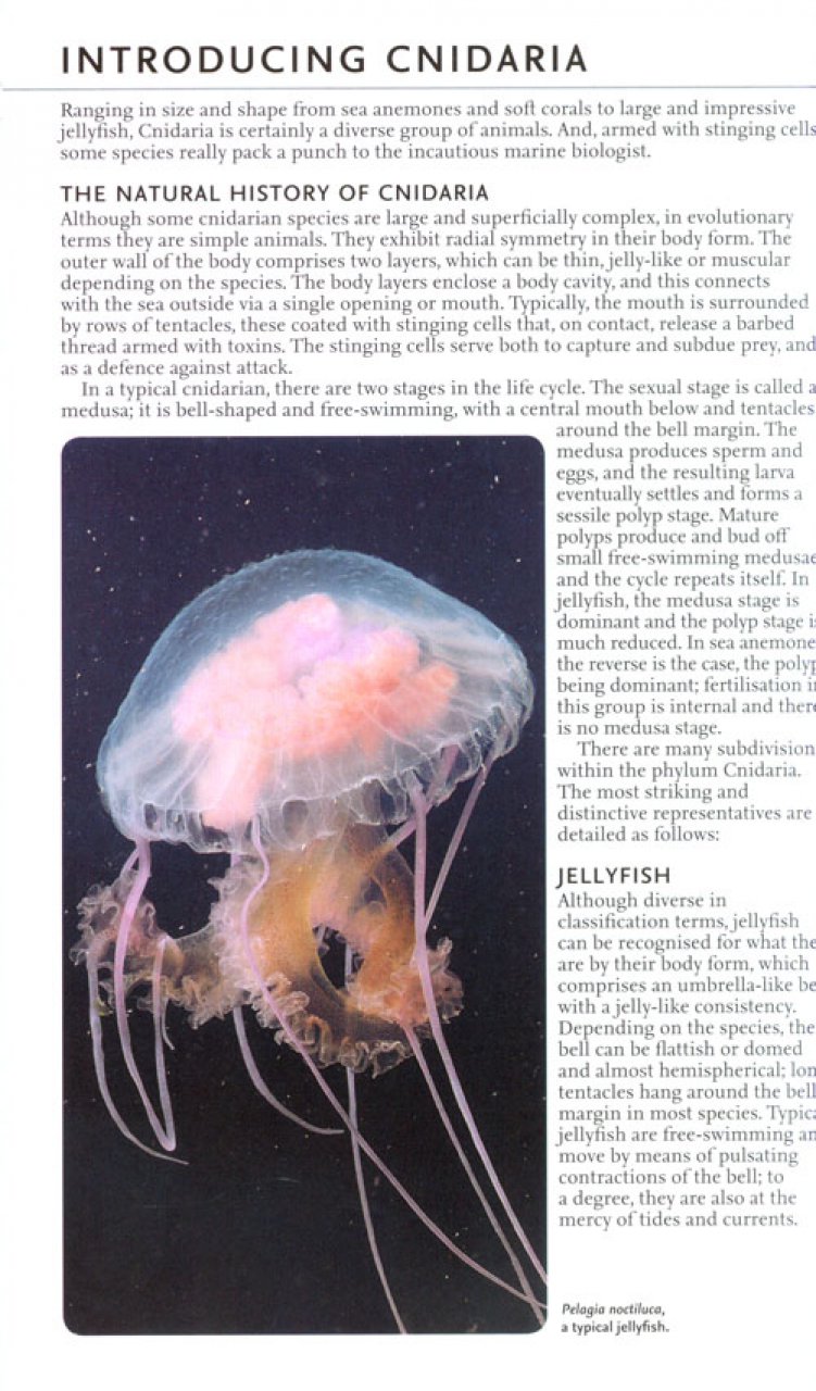 Both jellyfish and hydroids are related to sea-anemones and corals: they’re all classified as cnidaria, from the Greek κνιδη, knidē, meaning “nettle”. In short: they all sting. Some swim and sway too: the colours, patterns and sinuosity of the cnidaria are seductively strange. There are strawberry, snakelocks, gem, jewel, fountain and plumose anemones, for example: Actinia fragacea, Anemonia viridis, Aulactinia verrucosa, Corynactis viridis, Sargartiogeton laceratus and Metridium senile. The tentacles of the last-named look like a glossy head of white hair and the snakelocks anemone sometimes has green tentacles with purple tips.