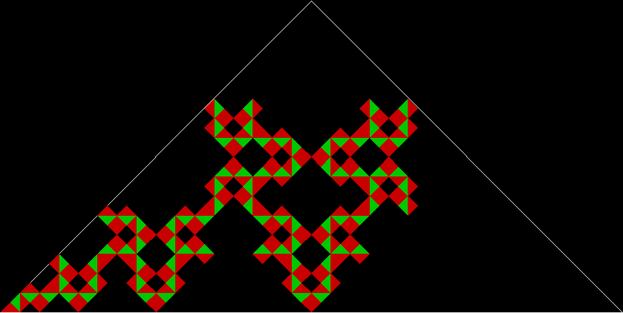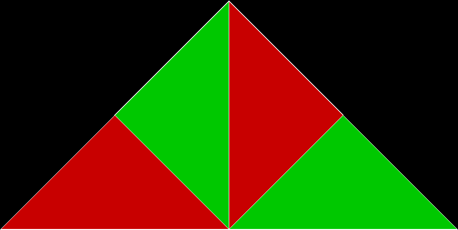 I didn’t expect to find the hourglass fractal playing with squares. I even less expected it playing with triangles. Isosceles right triangles, to be precise. Then again, I found it first playing with the L-triomino, which is composed of three squares. And an isosceles triangle is half of a square. So it all fits. This is an isosceles right triangle: