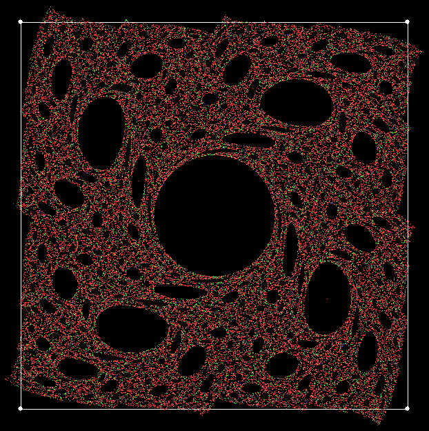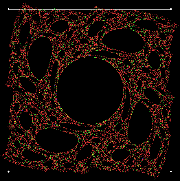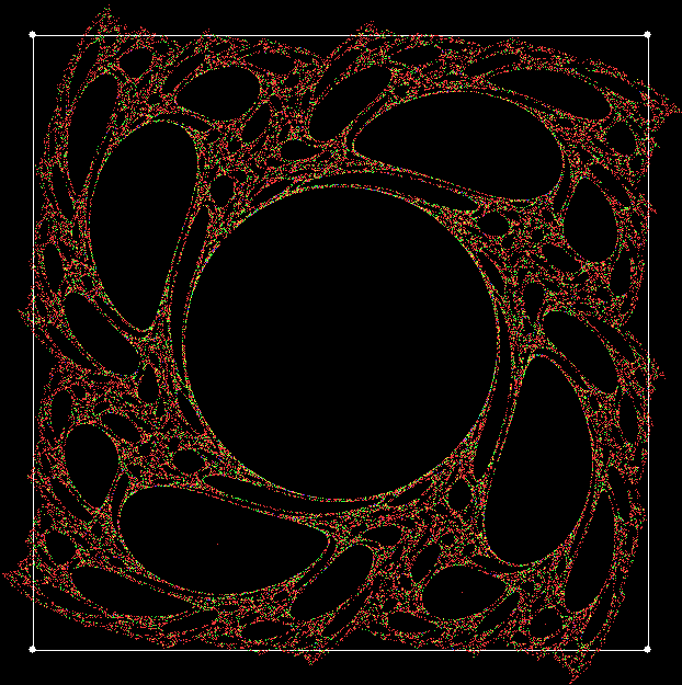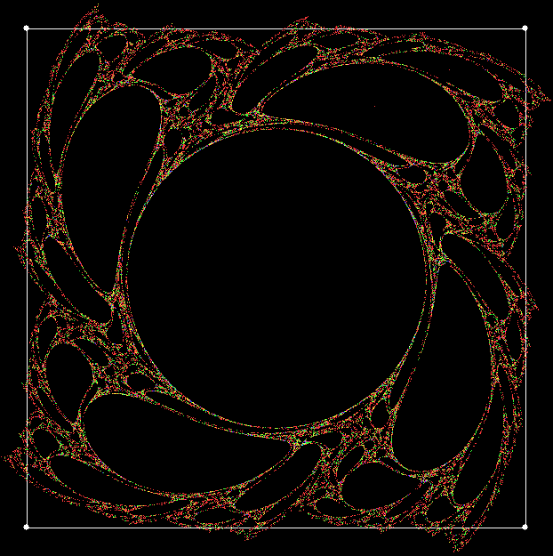As I showed in Polymorphous Perverticity, you can create fractals from squares and randomly moving points if you ban the point from choosing the same vertex twice in a row, and so on. But there are other ways. You can take the point, move it towards a vertex at random, then swing it around the center of the square through some angle before you mark its position, like this: