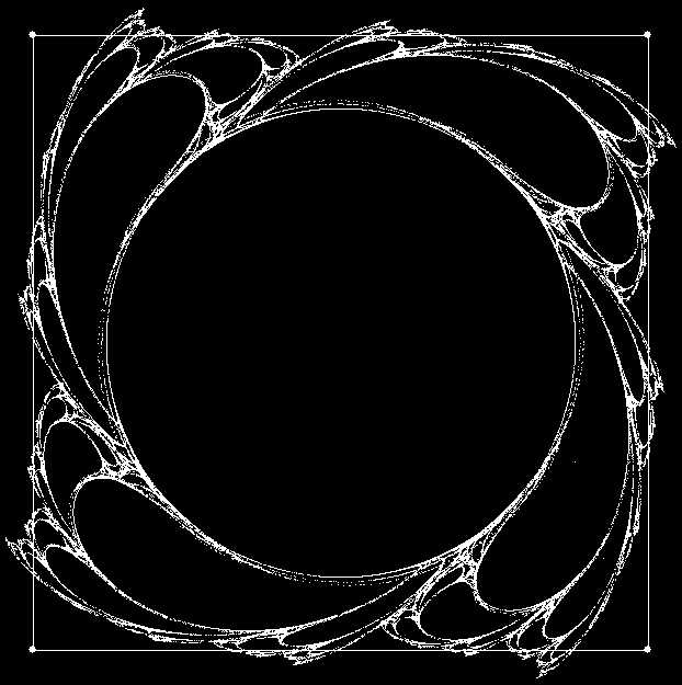 You can also reverse the swing at every second move, swing the point around a vertex instead of the center or around a point on the circle that encloses the square. Here are some of the fractals you get applying these techniques.