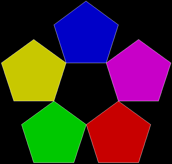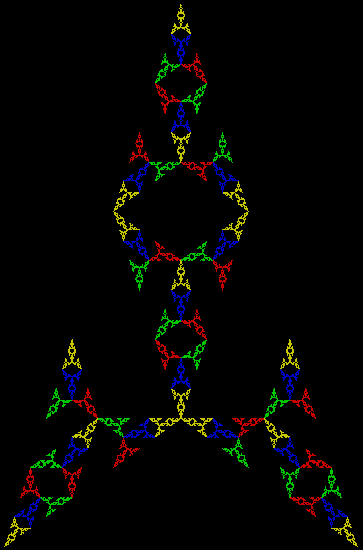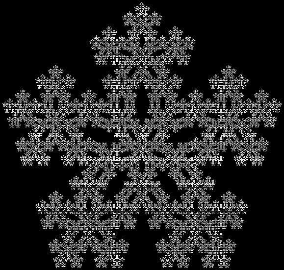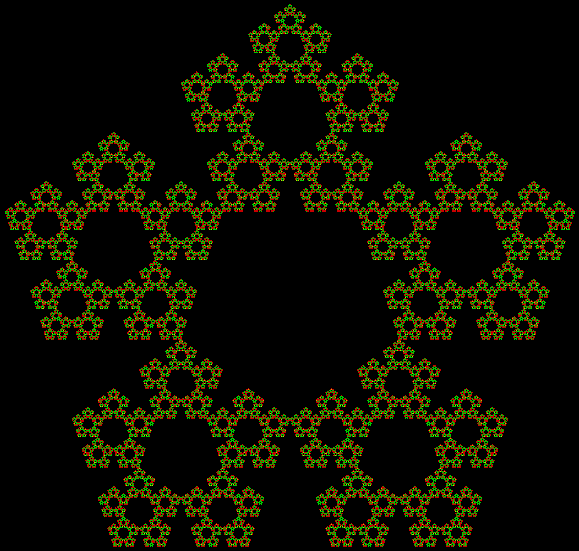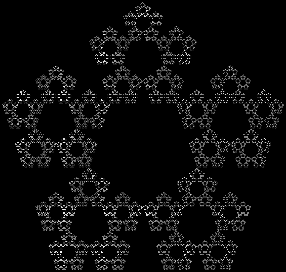 But what if he had been a young man with balls of different colours? This is a core question I want to interrogate issues around in terms of the narrative trajectory of this blog-post. Siriusly. But it’s not the keyliest core question. More corely keyly still, I want to ask what a fractal phallus might look like. Or a phrallus, for short. The narrative trajectory initializes with this fractal, which is known as a pentaflake (so-named from its resemblance to a snowflake):
