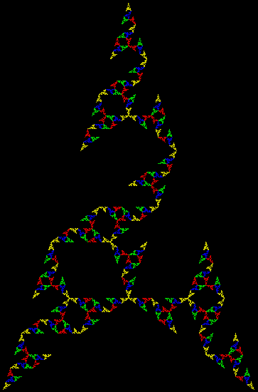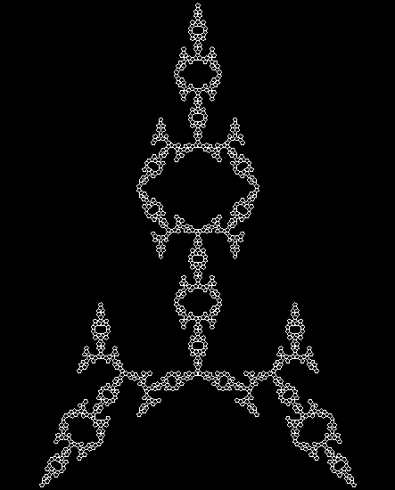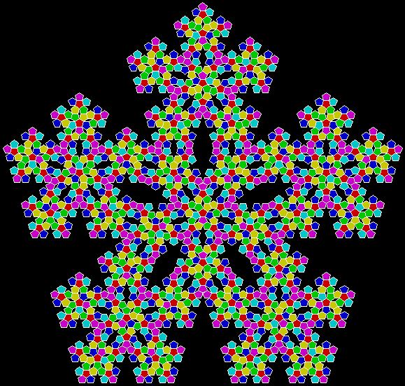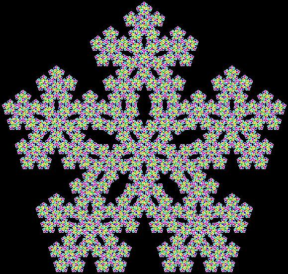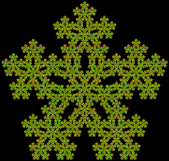 But what if he had been a young man with balls of different colours? This is a core question I want to interrogate issues around in terms of the narrative trajectory of this blog-post. Siriusly. But it’s not the keyliest core question. More corely keyly still, I want to ask what a fractal phallus might look like. Or a phrallus, for short. The narrative trajectory initializes with this fractal, which is known as a pentaflake (so-named from its resemblance to a snowflake):