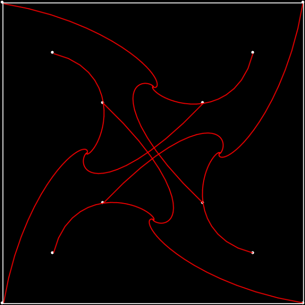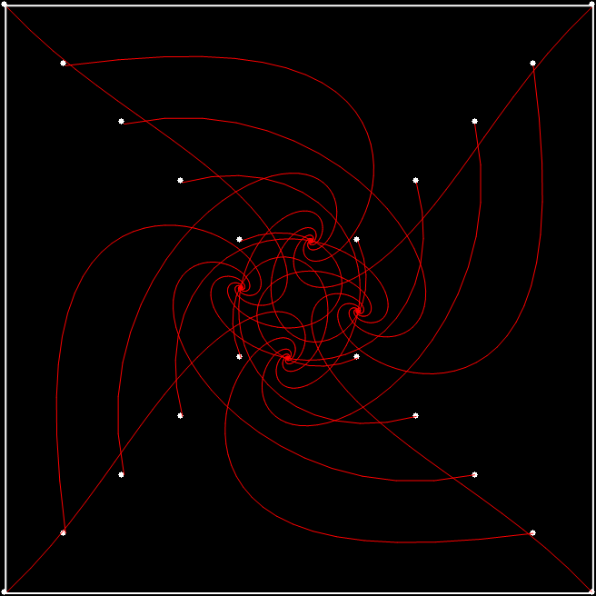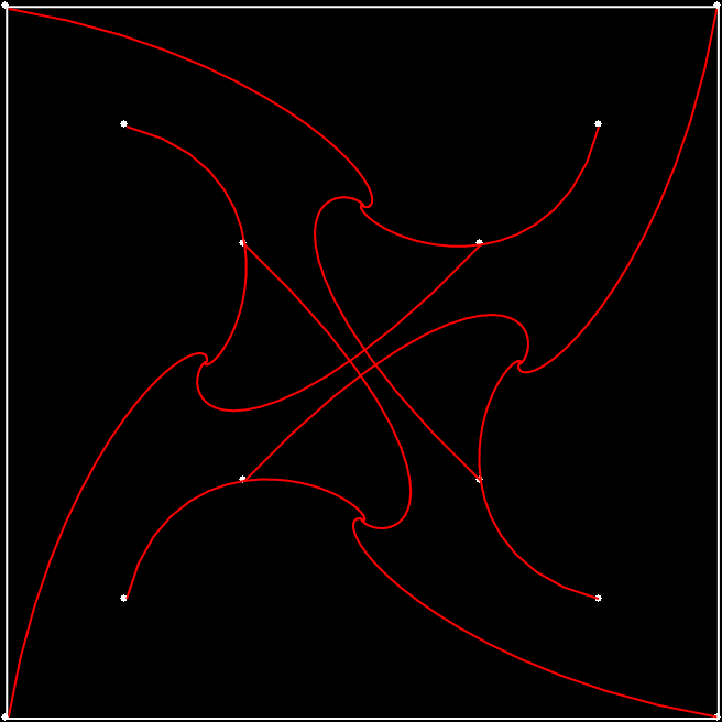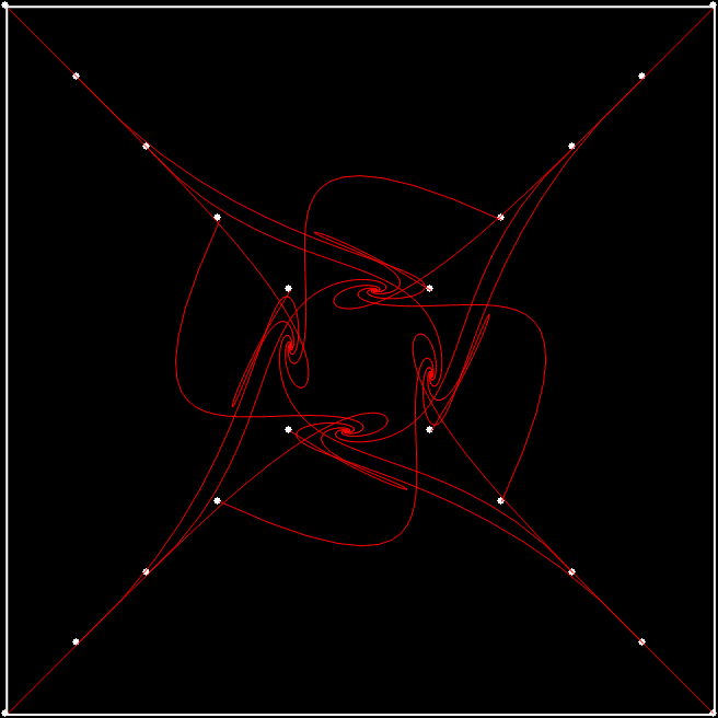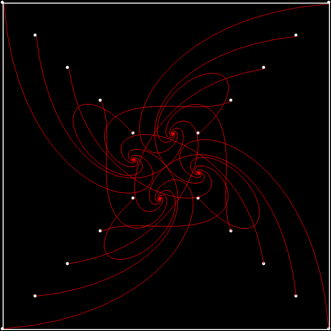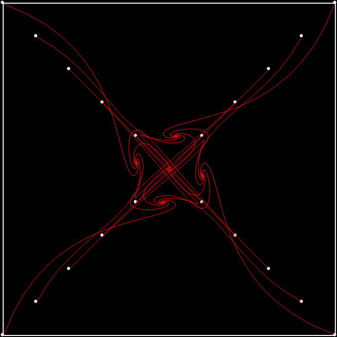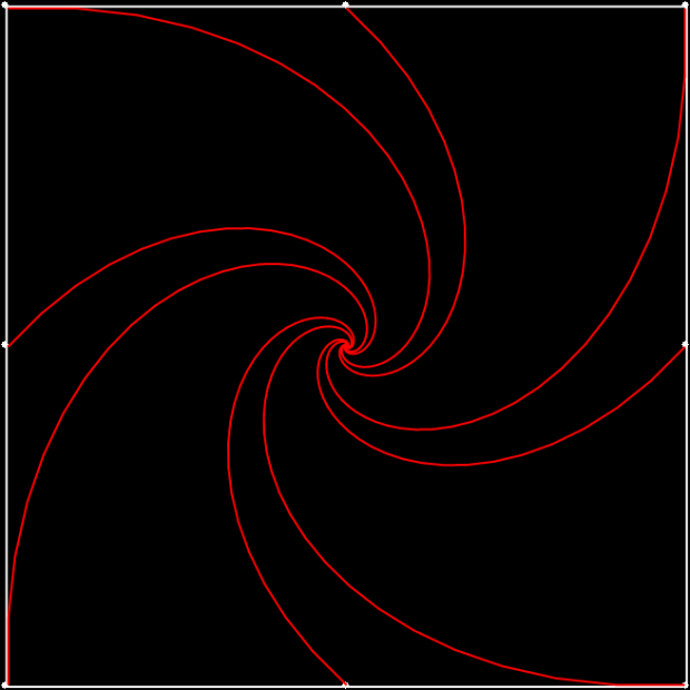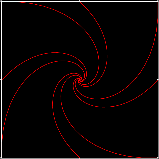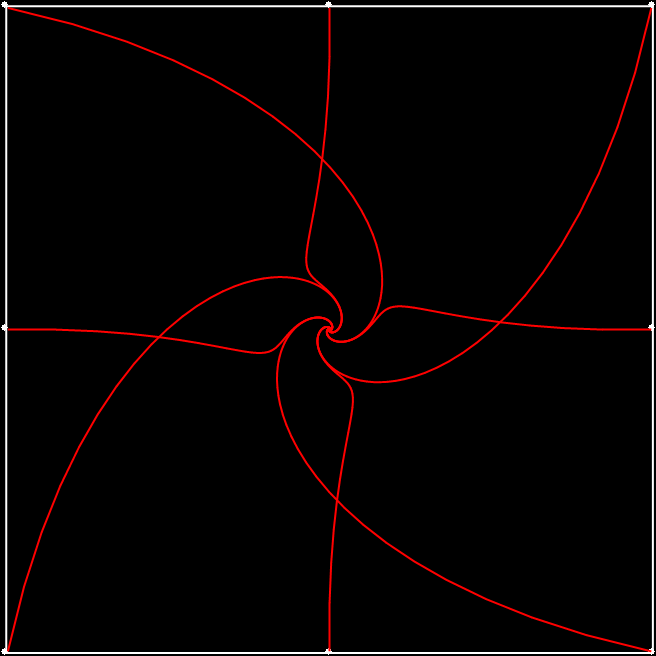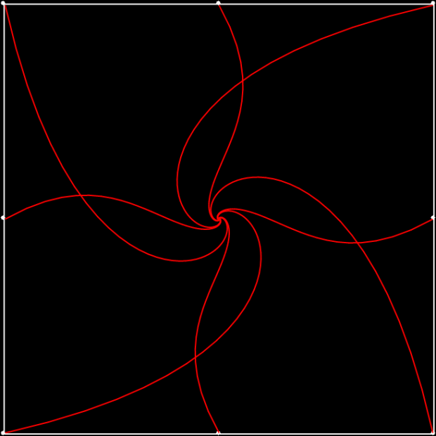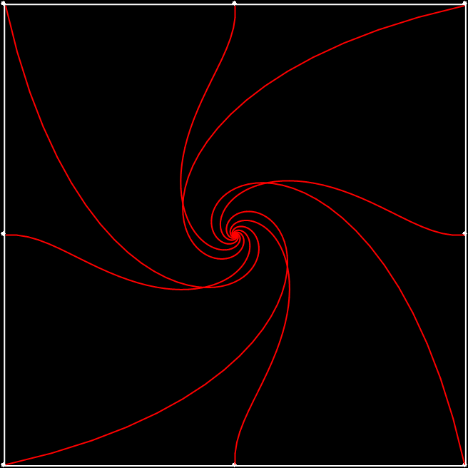 Now try a different arrangement of the mice. In the square below, the mice are arranged clockwise in rows from the bottom right-hand corner. That is, mouse #1 begins on the bottom left-hand corner, mouse #2 begins between that corner and the centre, mouse #3 begins on the bottom left-hand corner, and so on. When each mice runs towards the mouse three places away, these pursuit curves appear: