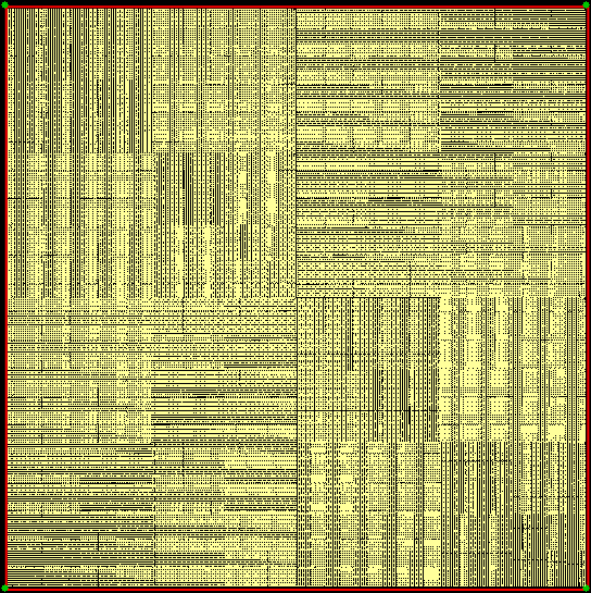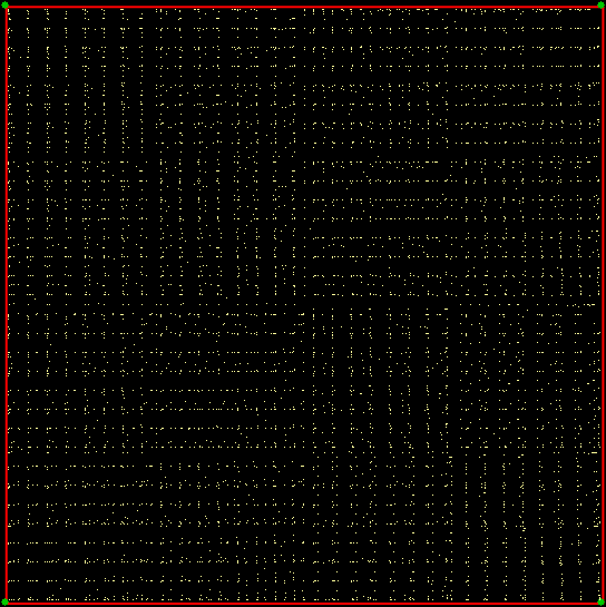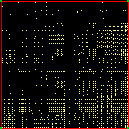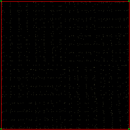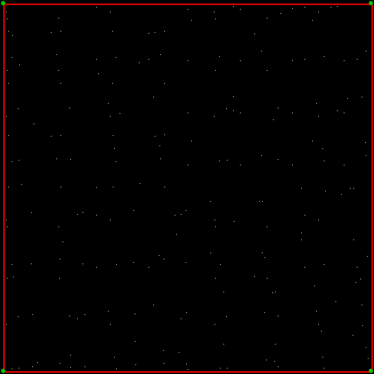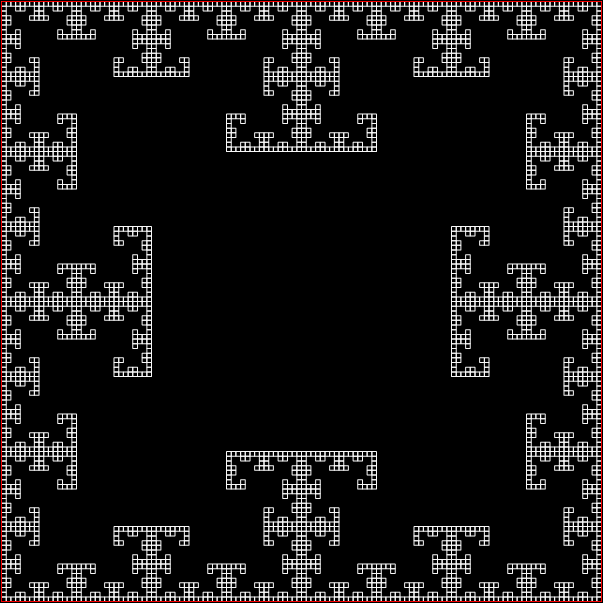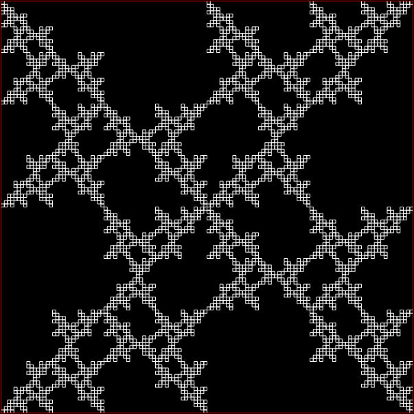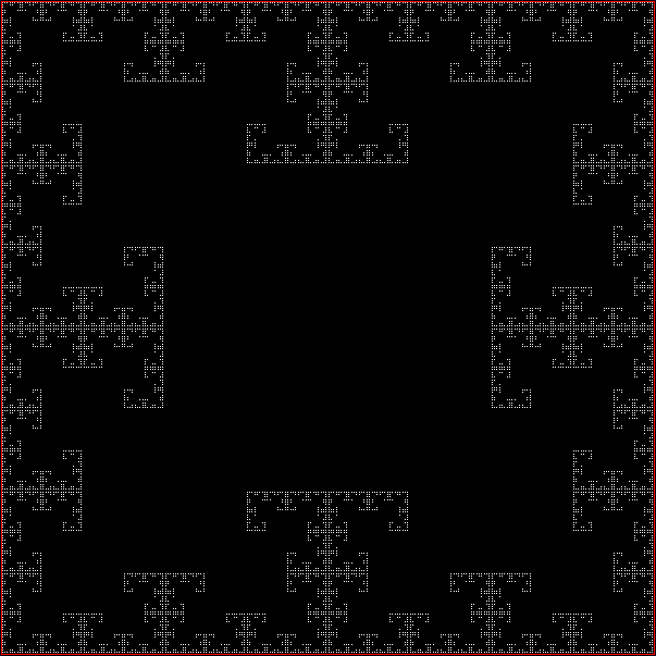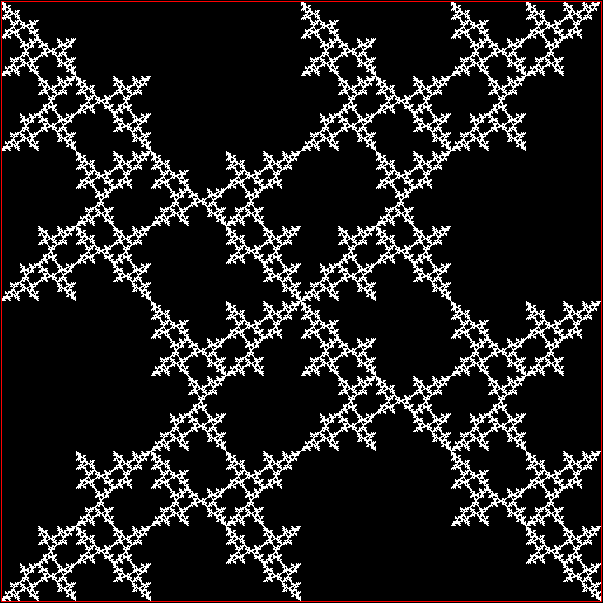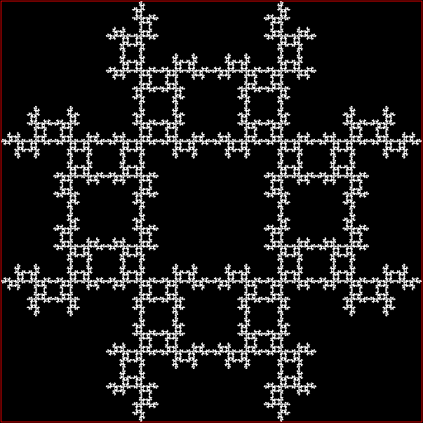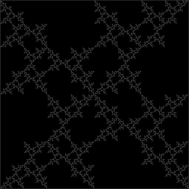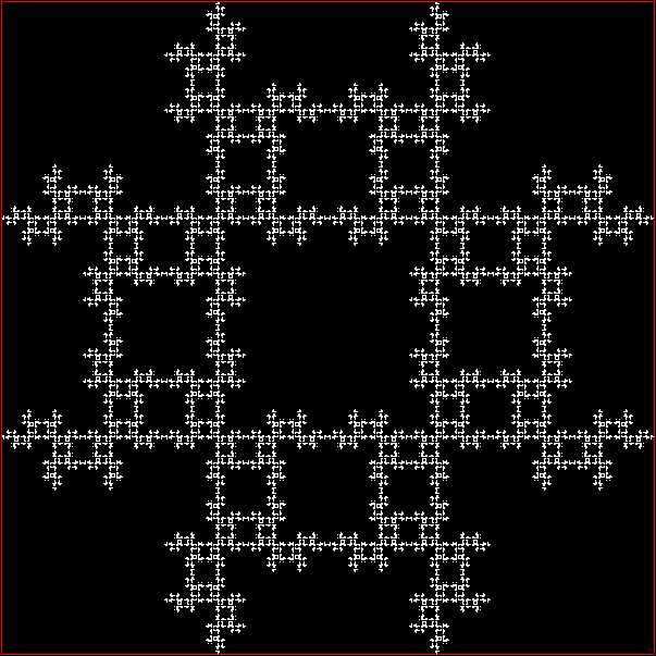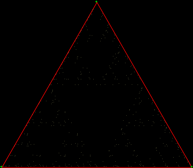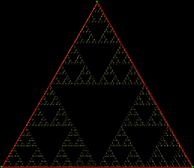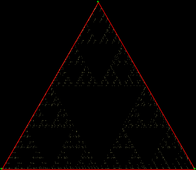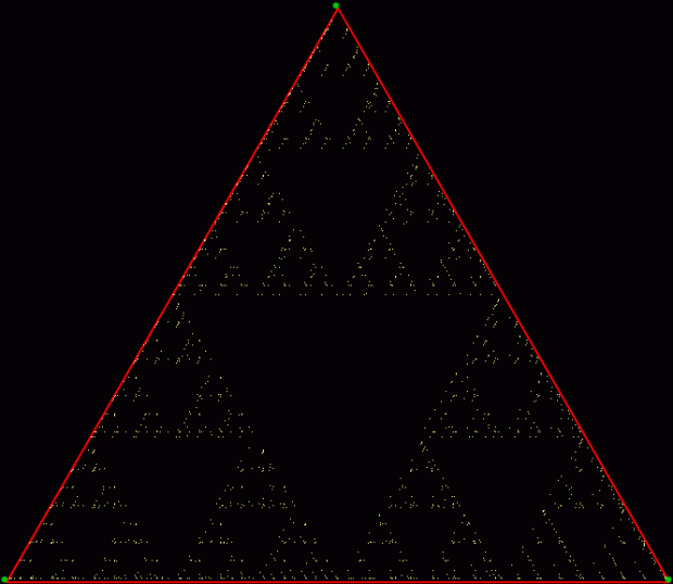 As you can see, more is less: the interior of the square simply fills with points and no attractive fractal appears. And because that was more is less, let’s see how less is more. What happens if you restrict the way in which the point inside the square can jump? Suppose it can’t jump twice towards the same vertex (i.e., the vertex v+0 is banned). This fractal appears: