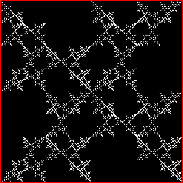 By taking four of these square-to-Sierpiński-triangle fractals and rotating them in the right way, you can re-create the three chaos-game fractals shown above. Here’s the [v+0]-ban fractal: