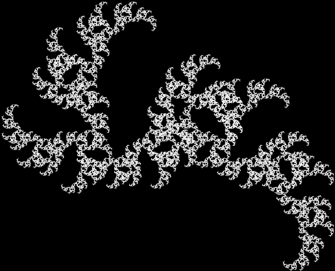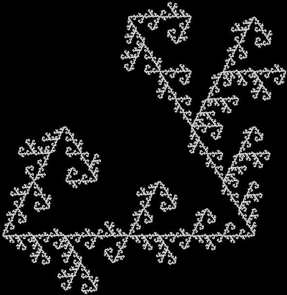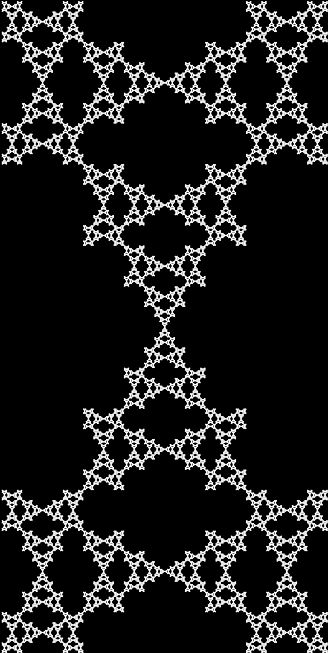 My misstep came when I was trying to do to a rep-16 L-tromino what I’d already done to a rep-4 L-tromino. And what had I already done? I’d created a beautiful shape called the hourglass fractal by dividing-and-discarding sub-copies of a rep-4 L-tromino. That is, I divided the L-tromino into four sub-copies, discarded one of the sub-copies, then repeated the process with the sub-sub-copies of the sub-copies, then the sub-sub-sub-copies of the sub-sub-copies, and so on: