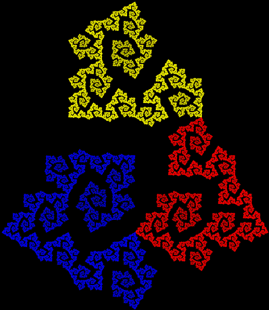 The blue sub-fractal is slightly larger than the other two (1.154700538379251…x larger, to be more exact, or √(4/3)x to be exactly exact). And because each sub-fractal can be divided into three sub-sub-fractals, the shape contains smaller and smaller copies of itself: