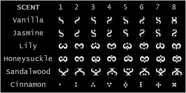 As can be seen, the letters, or osmemes, of the script fall into six eight-letter scent-series named after the closest equivalent scent in the present-day plant kingdom. The letters of each series will be distinguished in their wafted (that is, “spoken”) form by subtle chemical variations, although some may be created artificially to complete an incomplete series – eight will apparently have mystical significance for squirrels, perhaps under the influence of a mathematic mysticism among trees. For example,