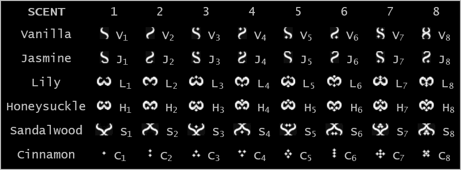 , or to become so in some dialects of Odoric. Each letter is transcribed into Roman using the initial of the scent in the series to which it will belong, plus a subscripted digit indicating its place in the series: the second letter of the Jasmine series,