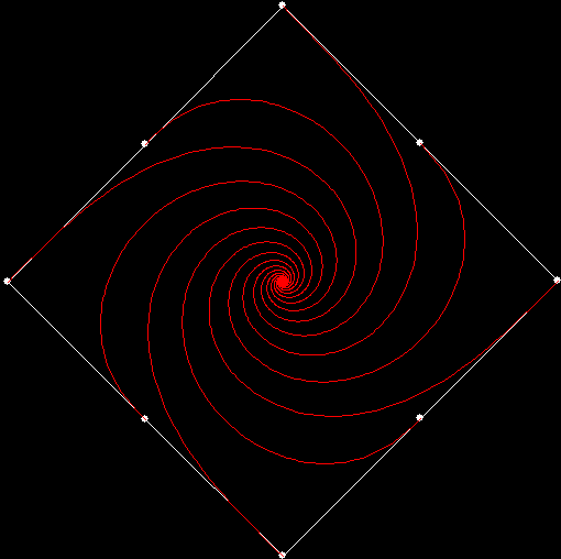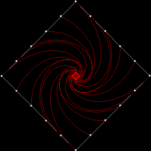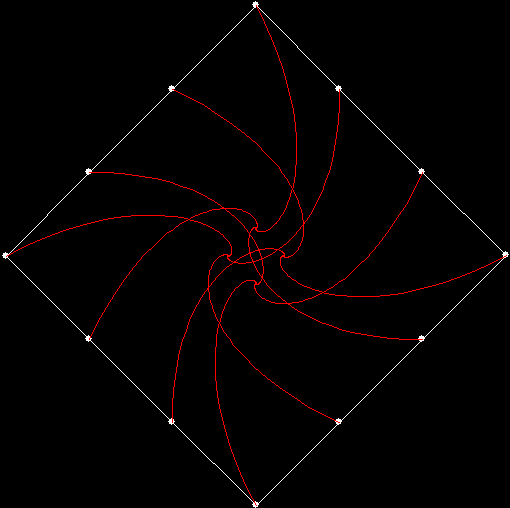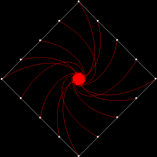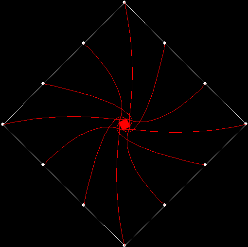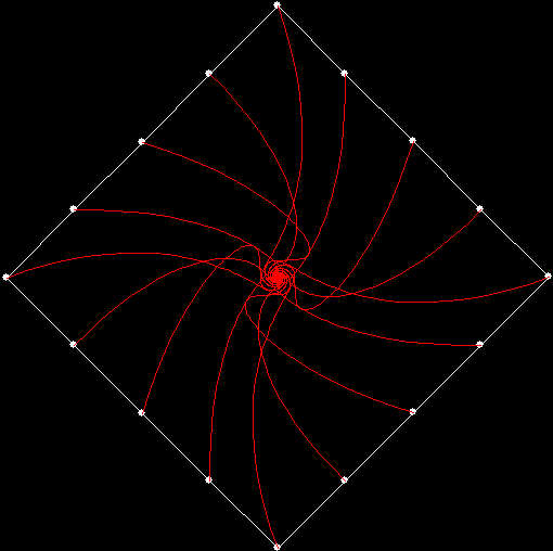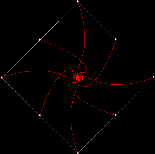 The mice spiral to the centre and meet, creating what are called pursuit curves. Now imagine eight mice on a square, four sitting on the corners, four sitting on the midpoints of the sides. Each mouse begins to run towards its clockwise neighbour. Now what happens? This: