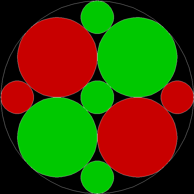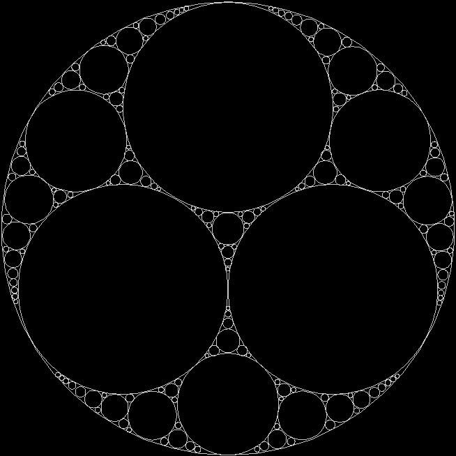 This shape has formal structure and beauty, but it has no explicit meaning. Its name has a divine echo: the Apollonian gasket or net, named after the Greek mathematician Apollonius of Perga (c.262 BC–c.190 BC), who was named after Apollo, god of music, poetry and mathematics. The Apollonian gasket is a fractal, but the version above is not as fractal as it could be. I wondered what it would look like if, like fleas preying on fleas, circles appeared inside circles, gaskets within gaskets. I haven’t managed to program the shape properly yet, but here is my first effort at an Intra-Apollonian gasket: