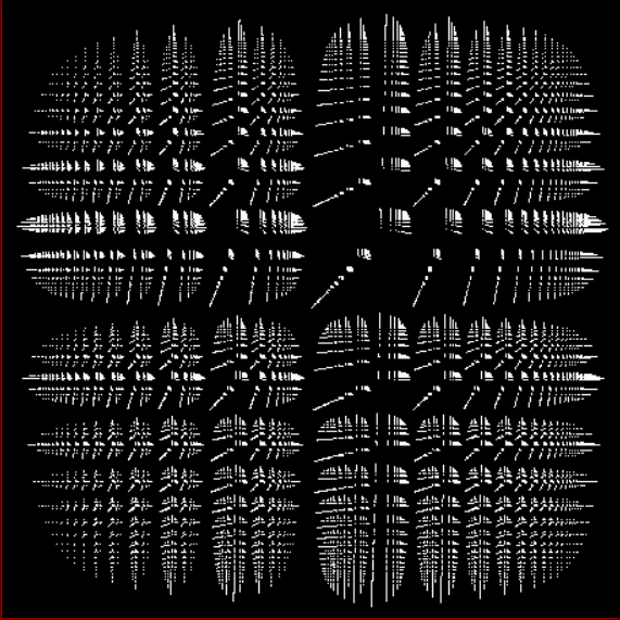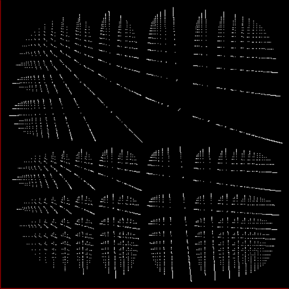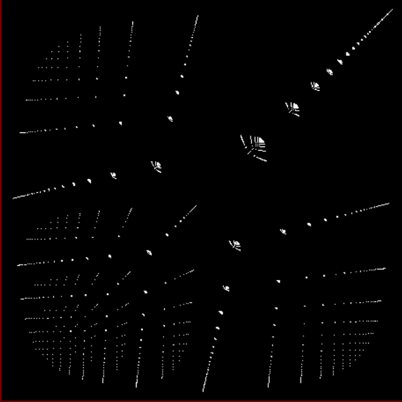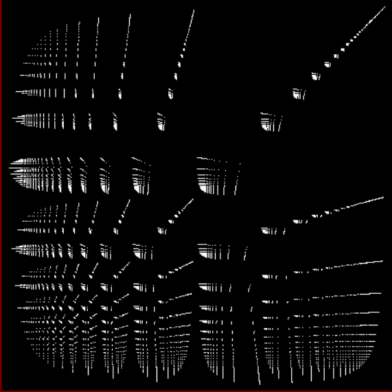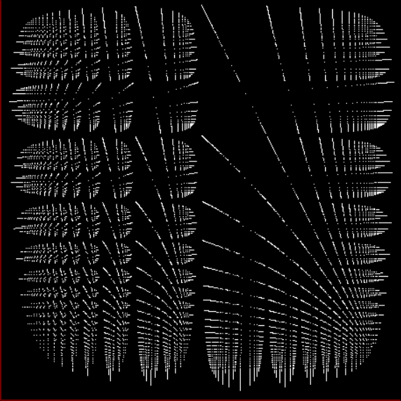 If you perm the worm in other ways, you get other shapes on the fract-L. I looked at continued fractions of fixed length, 4, 5 and 6, and permed them using one of the permutations of [1,2,3,4], [1,2,3,4,5] and [1,2,3,4,5,6]. Here’s a graph for fractions, a/b, and permed fractions, perm(a/b), where length(contfrac(a/b)) = 4: