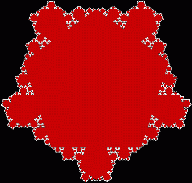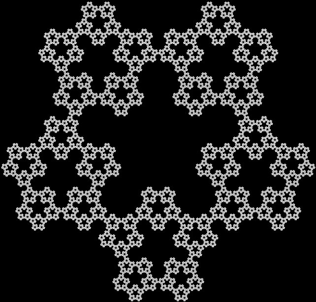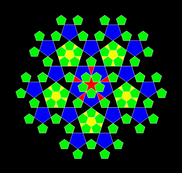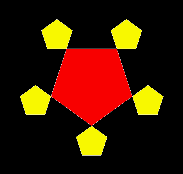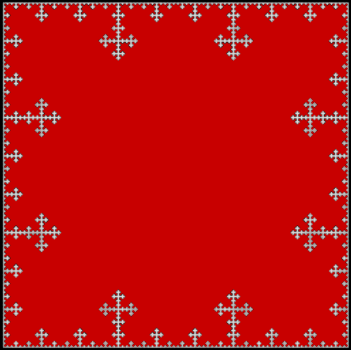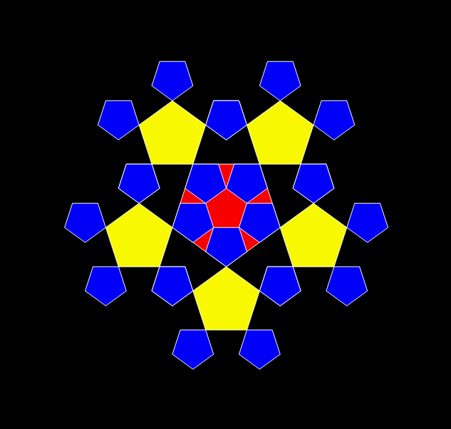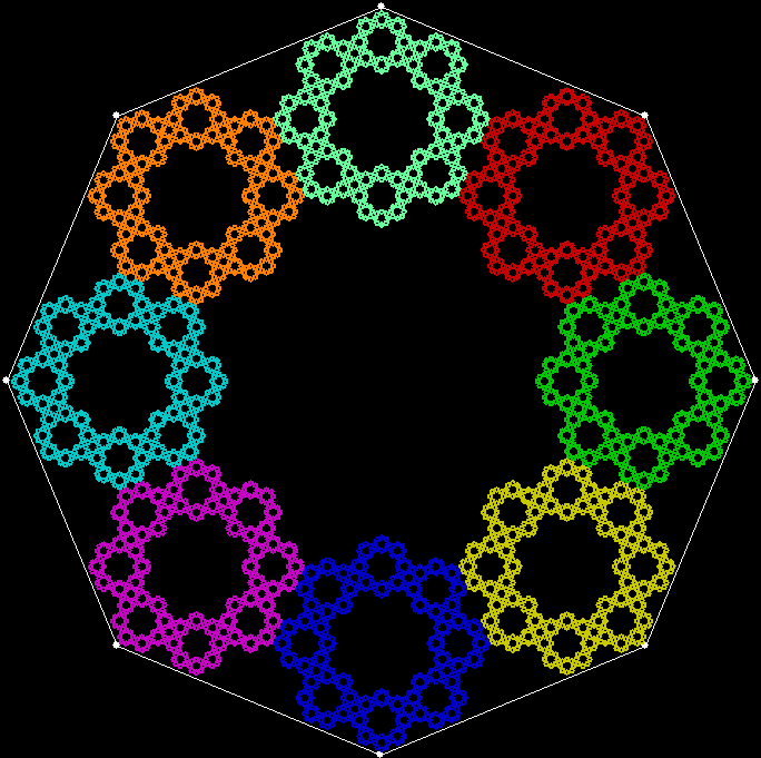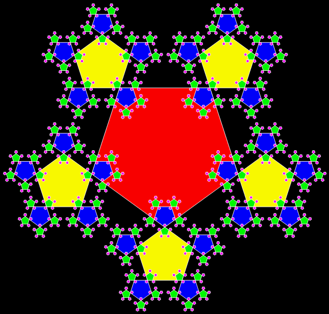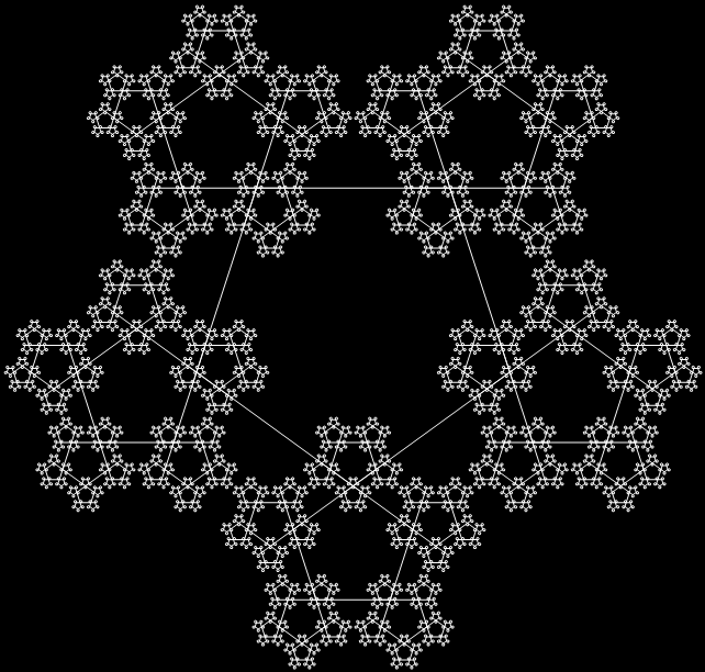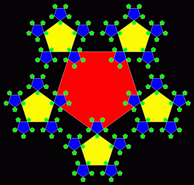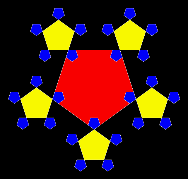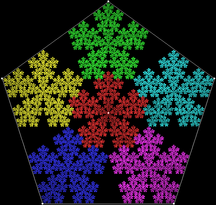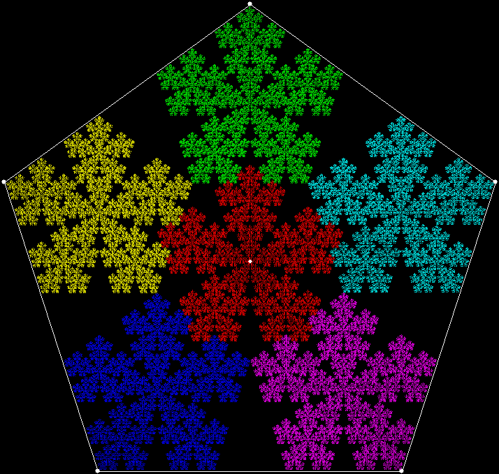 That fractal is known as a Sierpiński carpet. Now up to the pentagon. This fractal of endlessly nested contingent pentagons is created by a point jumping 1/φ = 0·6180339887… of the distance towards the five vertices: