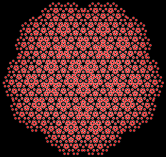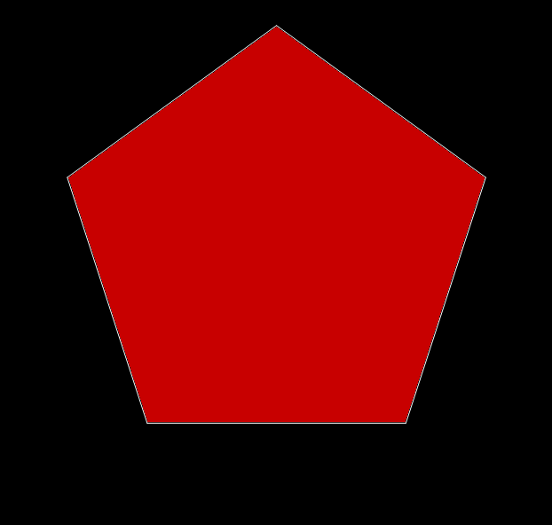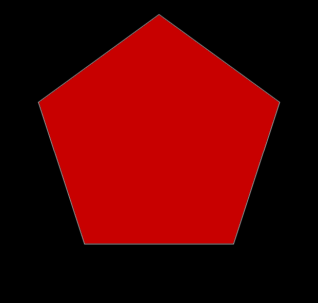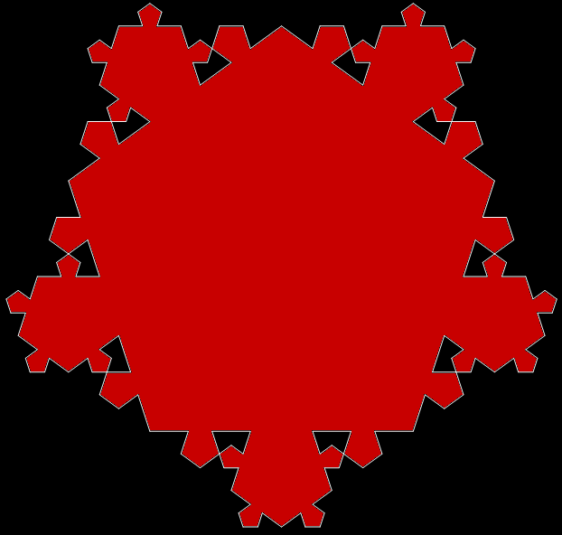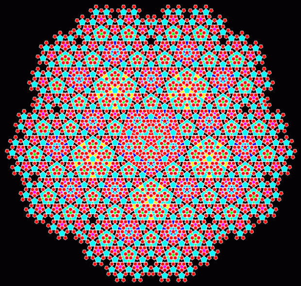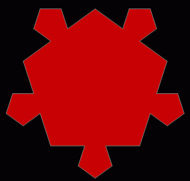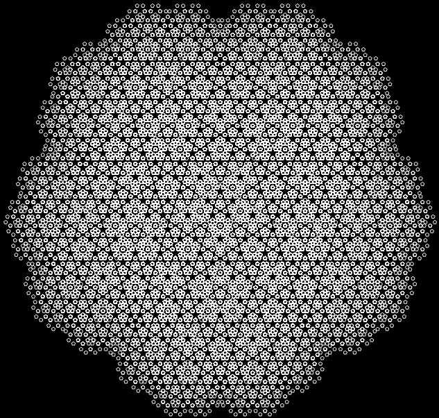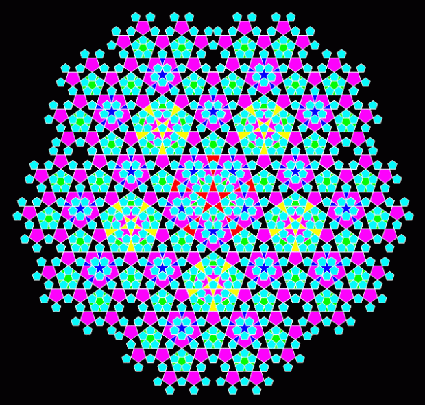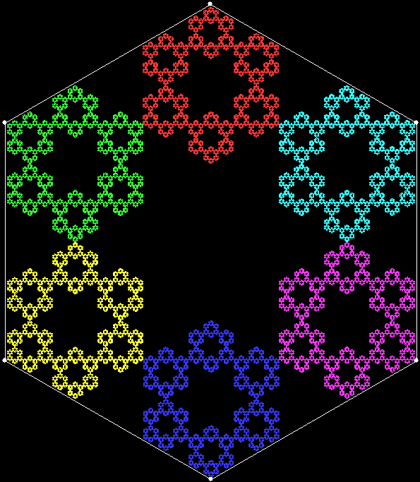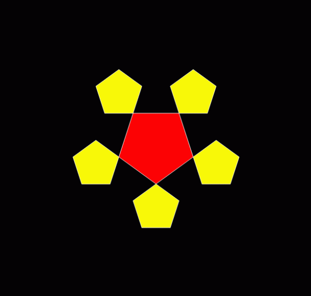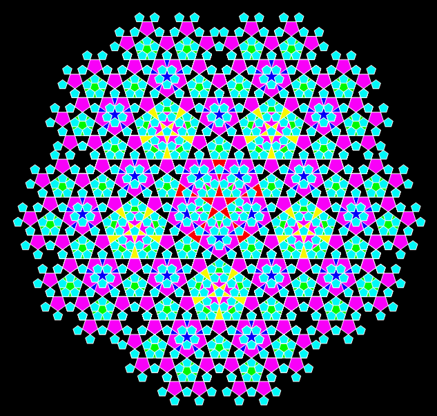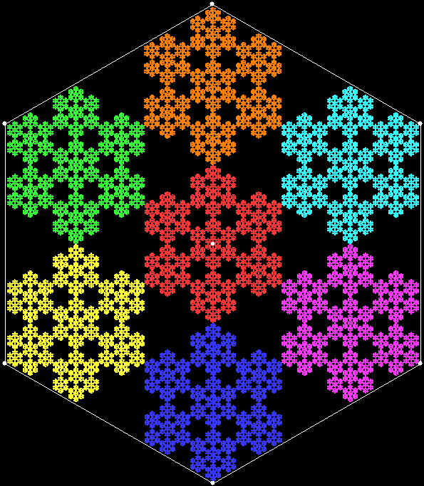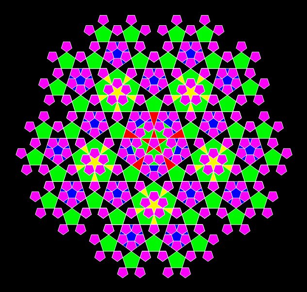 That fractal is known as a Sierpiński carpet. Now up to the pentagon. This fractal of endlessly nested contingent pentagons is created by a point jumping 1/φ = 0·6180339887… of the distance towards the five vertices: