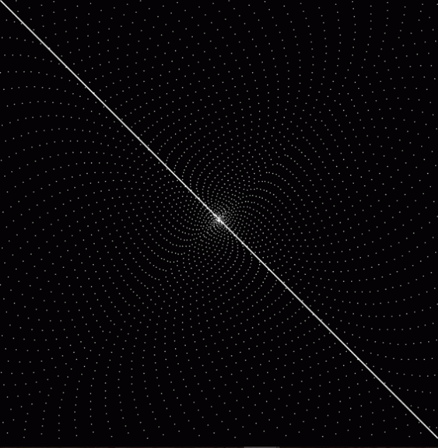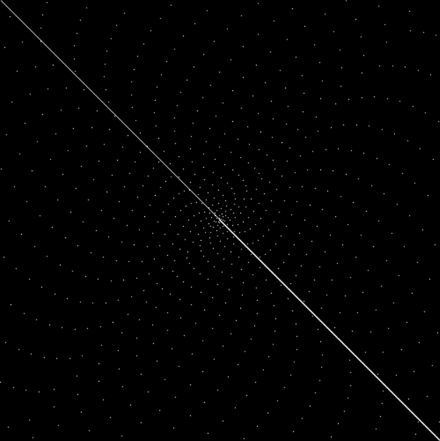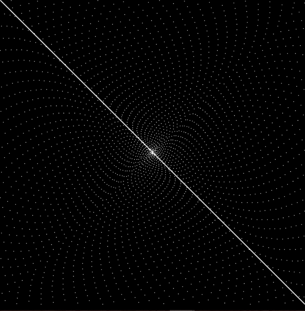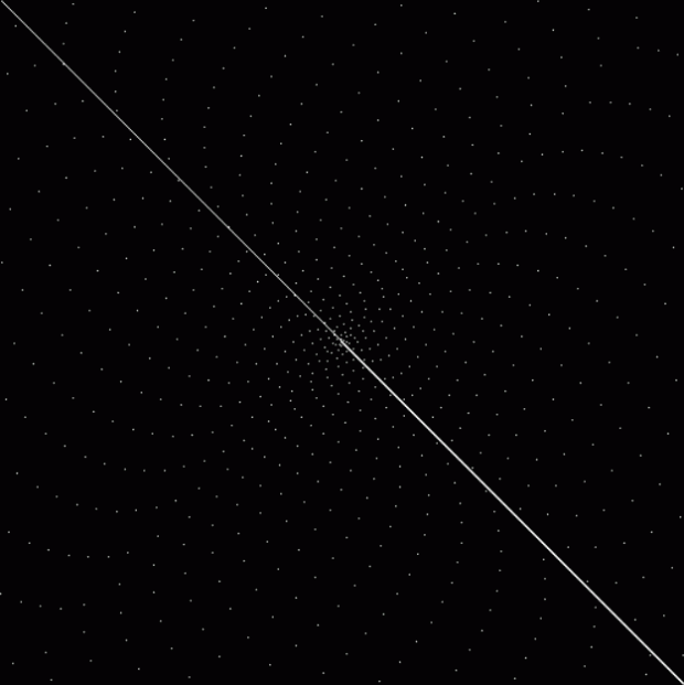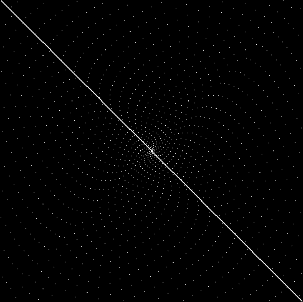 Unlike the Ulam spiral, however, the Eulerphi graph is cramped. But it’s easy to stretch it. You can represent φ(n) as a fraction between 0 and 1 like this: phifrac(n) = φ(n) / (n-1). Using phifrac(n), you can create Eulerphi bands, like this: