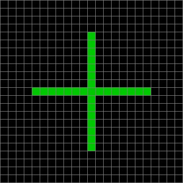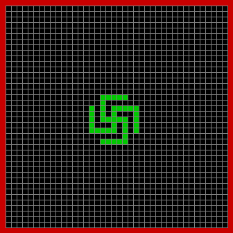 Let’s look at Life in action, with the seeding counters shown in green. Sometimes the seed will evolve and disappear, sometimes it will evolve into one or more fixed shapes, sometimes it will evolve into dynamic shapes that repeat again and again. Here’s an example of a seed that evolves and disappears:
