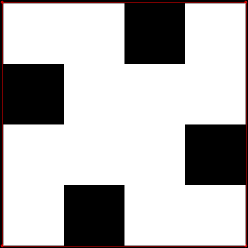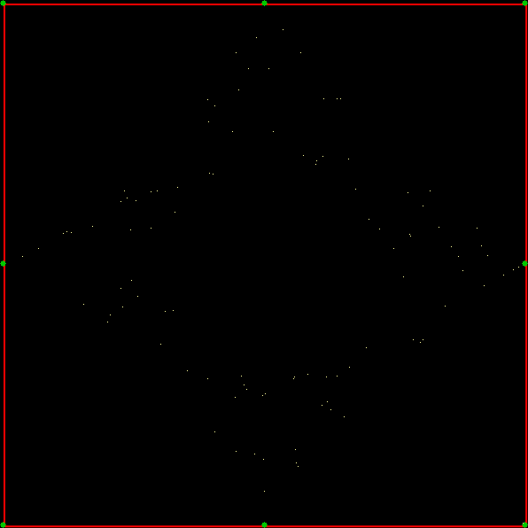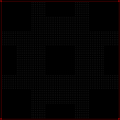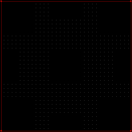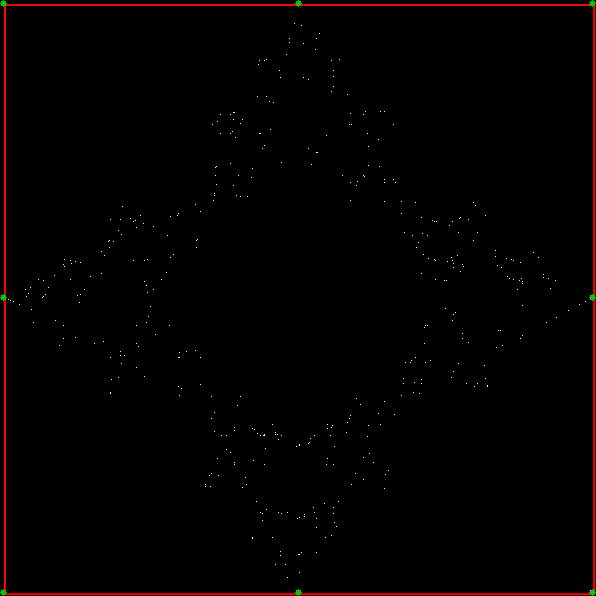 So you can create these fractals either with a jumping point or by subdividing a square. But in fact I discovered the subdivided-square route by looking at a variant of the jumping-point route. I wondered what would happen if you took a point inside a square, allowed it to trace all possible routes towards the vertices without marking its position, then imposed the restriction for Fractal #1 on its final jump, namely, that it couldn’t jump towards the vertex it jumped towards on its previous jump. If the point is marked after its final jump, this is what appears (if the routes chosen had been truly random, the image would be similar but messier):
