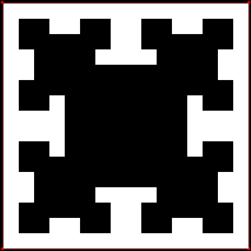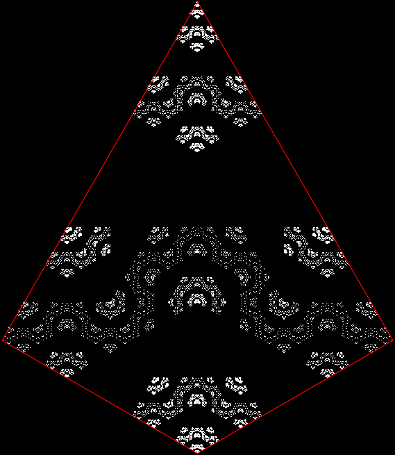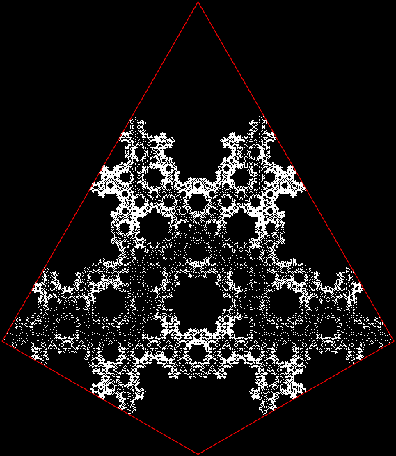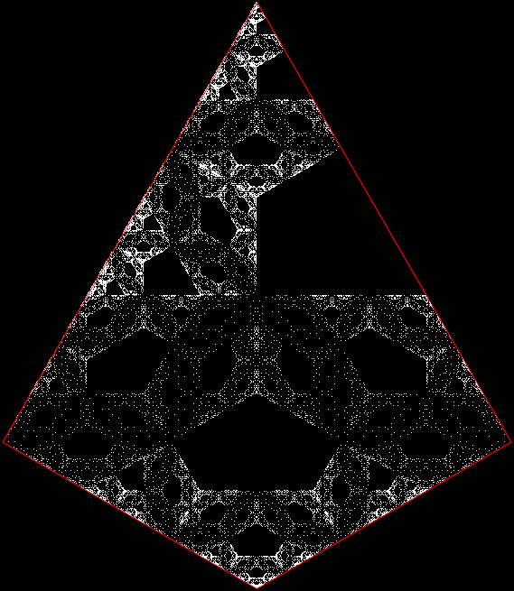 If the point can’t jump towards the vertex two places clockwise of the vertex it’s just jumped towards, this fractal appears (two places clockwise is also two places anticlockwise, i.e. the banned vertex is diagonally opposite):