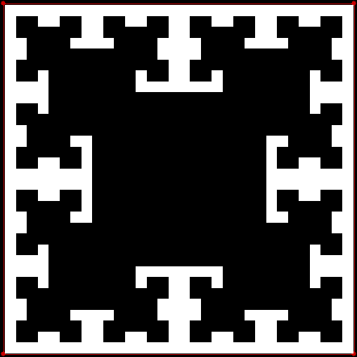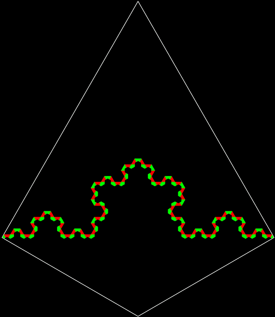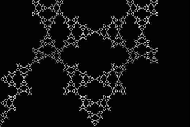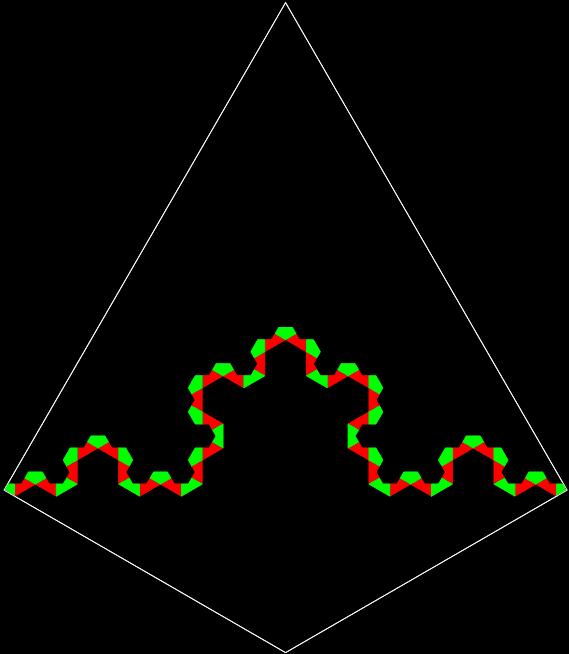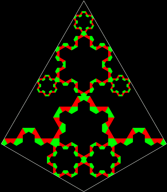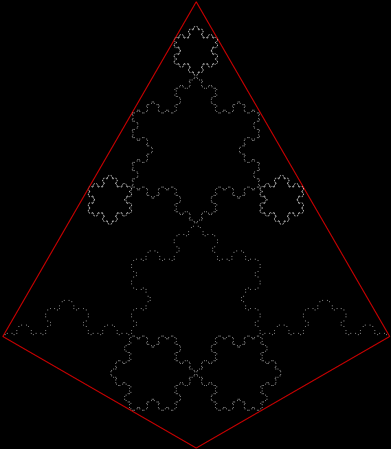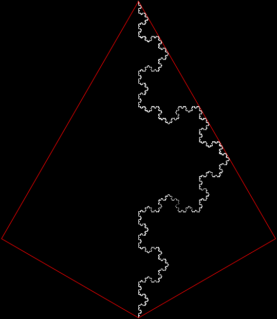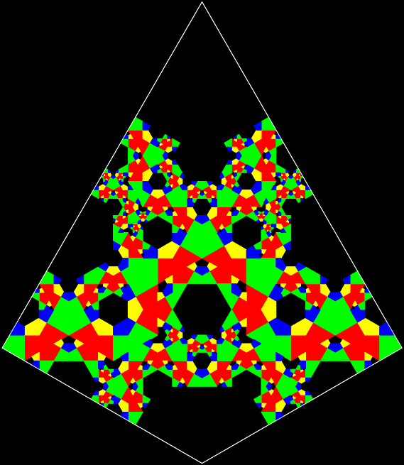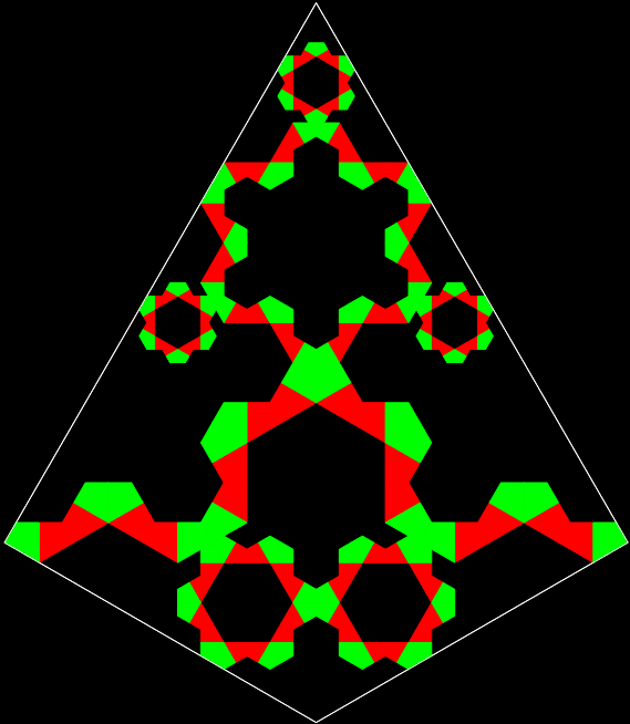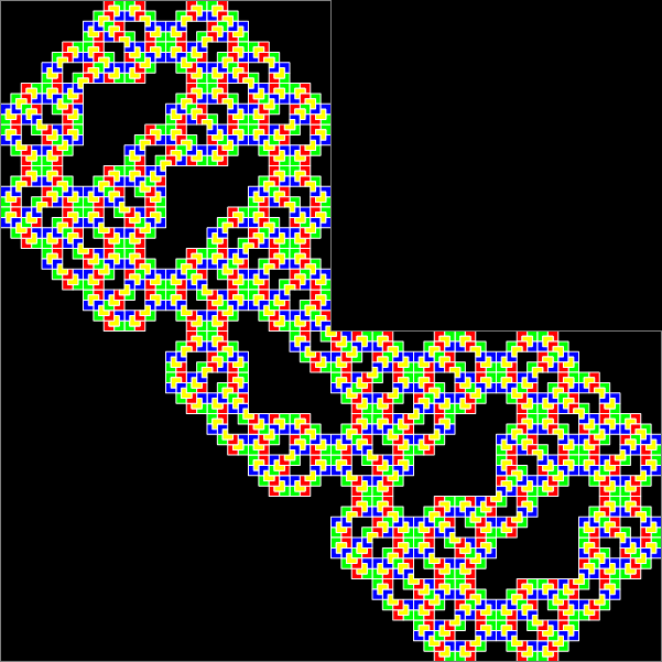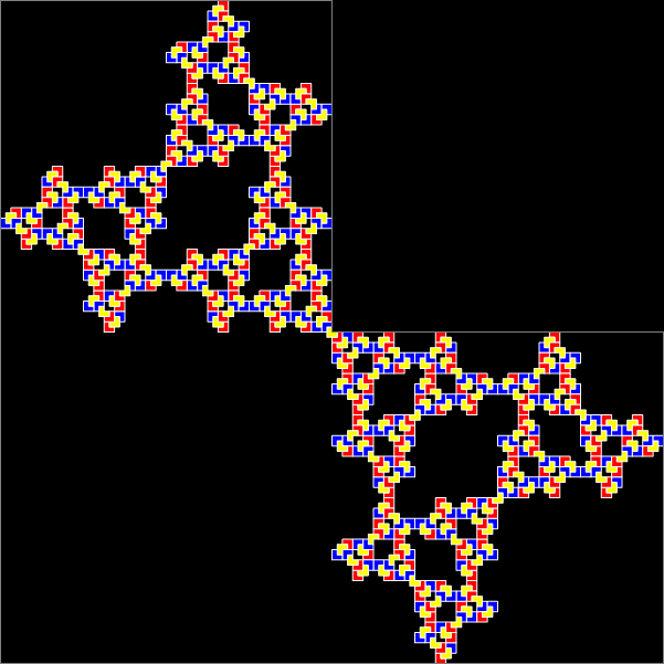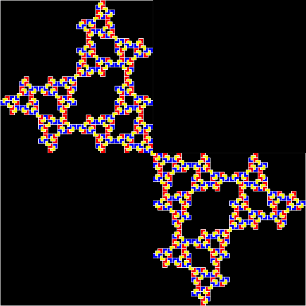 My misstep came when I was trying to do to a rep-16 L-tromino what I’d already done to a rep-4 L-tromino. And what had I already done? I’d created a beautiful shape called the hourglass fractal by dividing-and-discarding sub-copies of a rep-4 L-tromino. That is, I divided the L-tromino into four sub-copies, discarded one of the sub-copies, then repeated the process with the sub-sub-copies of the sub-copies, then the sub-sub-sub-copies of the sub-sub-copies, and so on: