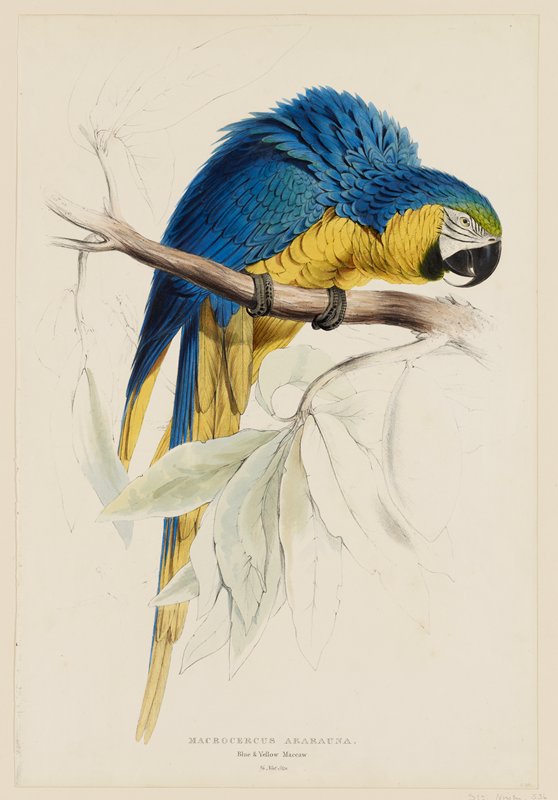 Blue-and-yellow macaw, Ara ararauna (Linnaeus, 1758), by Edward Lear (1812-1888)