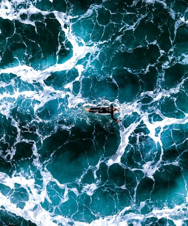 Surfer amid sea-foam on Main beach, Stradbroke Island, Queensland (by Piotr Parzybok in The Ex-Term-in-a-tor)