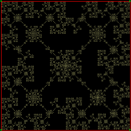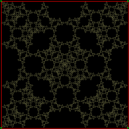 Nothing interesting can emerge from that set of squares. Or can it? As I showed in Curvous Energy, it can. Suppose that the gray square is dividing into the colored squares like a kind of amoeba. And suppose that the colored squares divide in their turn. So square divides into sub-squares and sub-squares divide into sub-sub-squares. And so on. And all the squares keep the same relative orientation.